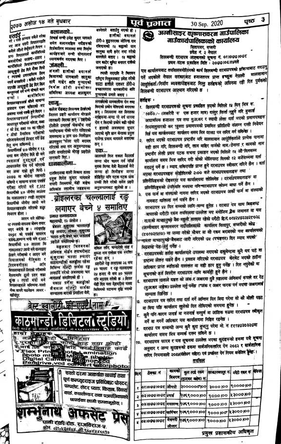 » अग्निसाइर कृष्णासवरन गाउँपालिका (सिलबन्दी दरभापत्र आह्वानको सूचना प्रथम पटक प्रकाशित भएको मिति २०७७/०६/१४