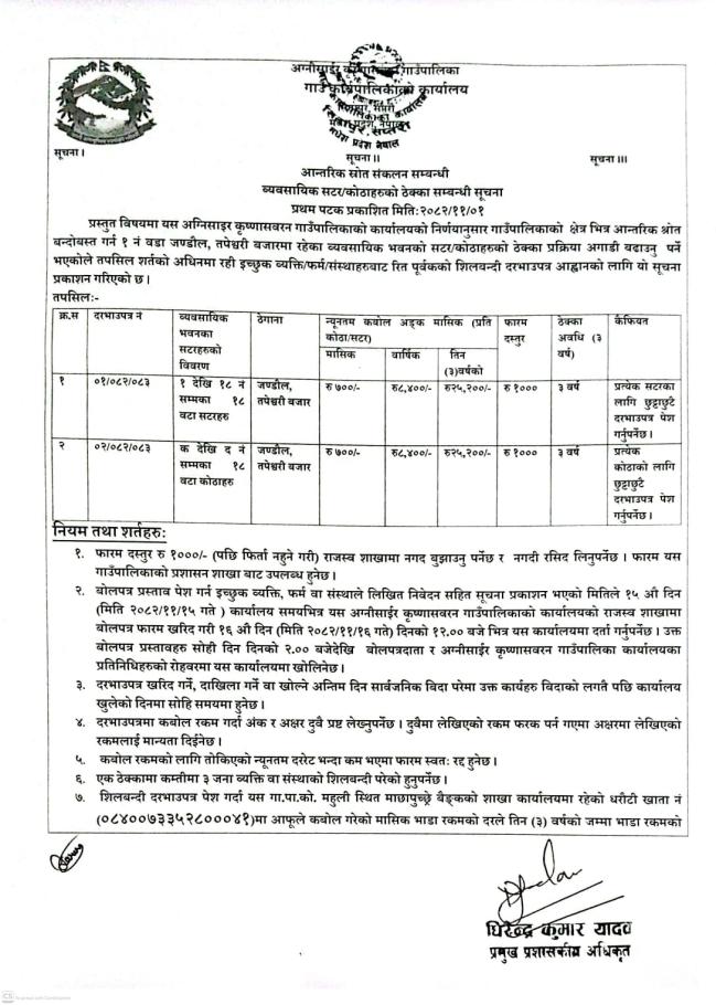 व्यवसायिक सटर/कोठाहरुको ठेक्का सम्बन्धी सूचना तेस्रो पटक प्रकाशित मिति २०८२/१२/१७