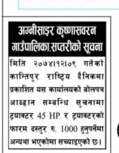 व्यवसायिक सटर/कोठाहरुको ठेक्का सम्बन्धी सूचना तेस्रो पटक प्रकाशित मिति २०८२/१२/१७