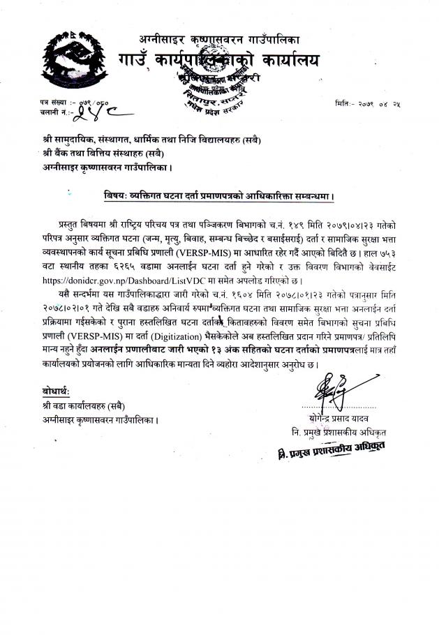 » व्यक्तिगत घटना दर्ता प्रमाणपत्रको आधिकारिक्ता सम्बन्धमा
