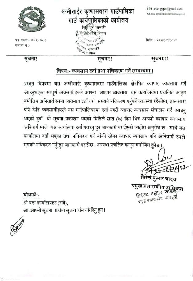 व्यवसायिक दर्ता तथा नविकारण गर्ने सम्बन्धी सूचना