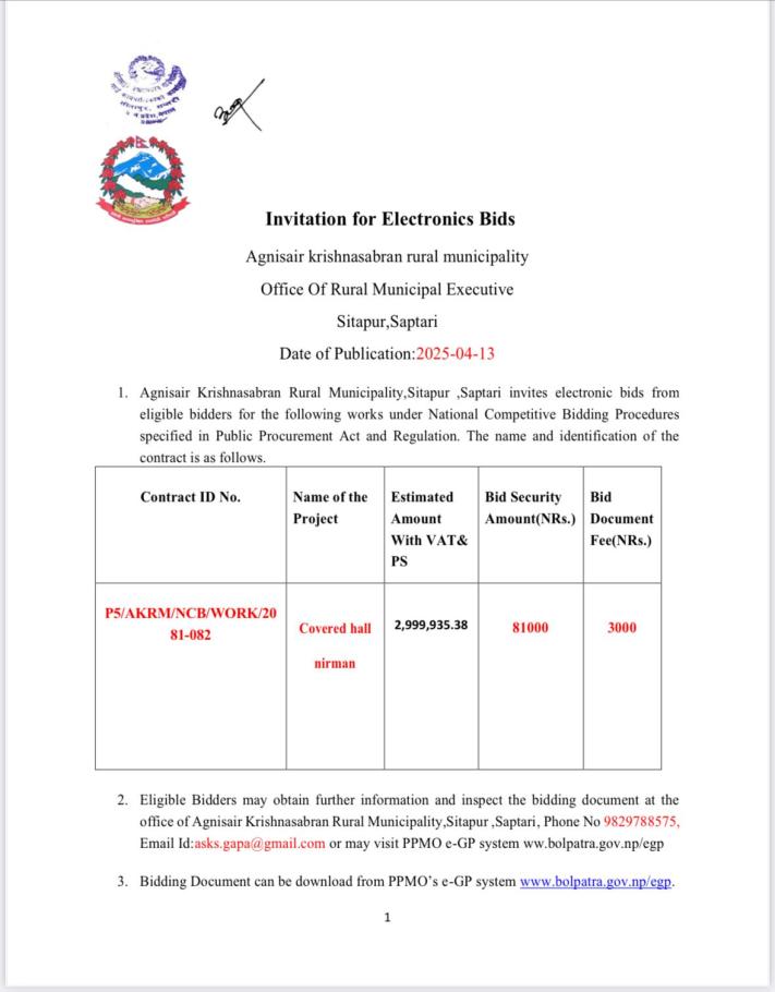 Invitation for Electronic Bid र बोलपत्र स्वीकृत गर्ने आशयको सूचना