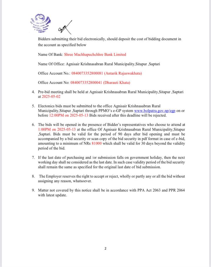 आ.व.०८२/८३ को पोखरी ठेक्का सम्बन्धी शिलबन्दी दरभाउपत्र आह्रवानको सूचना (दोस्रो पटक प्रकाशित मिति २०८२/१०/२६)
