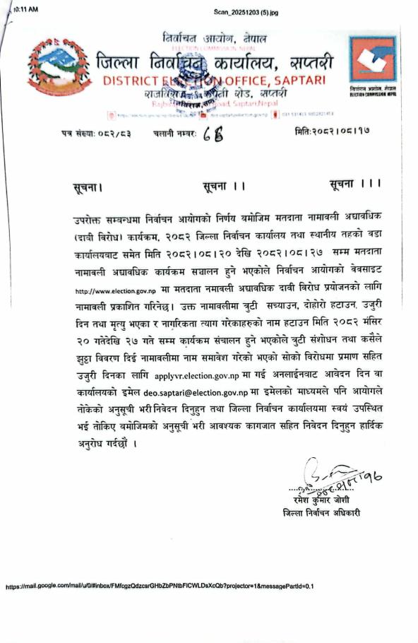 जिल्ला निर्वाचन कार्यालय सप्तरी सूचना