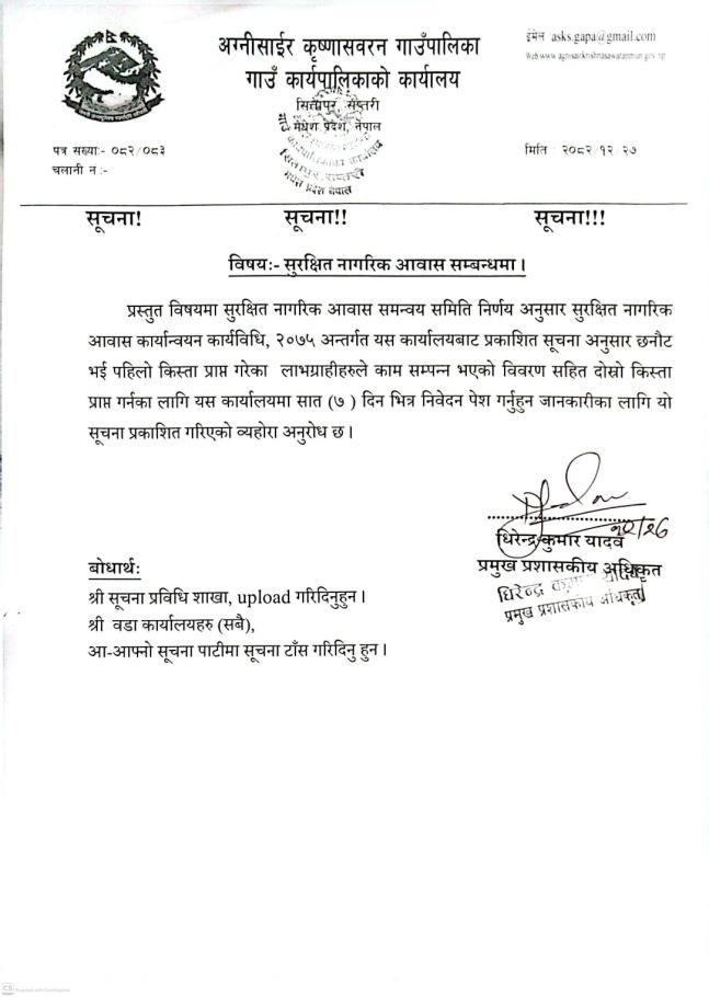 सूचना ।सूचना ।। सूचना ।।। सुरक्षित नागरिक आवास सम्बन्धमा ।