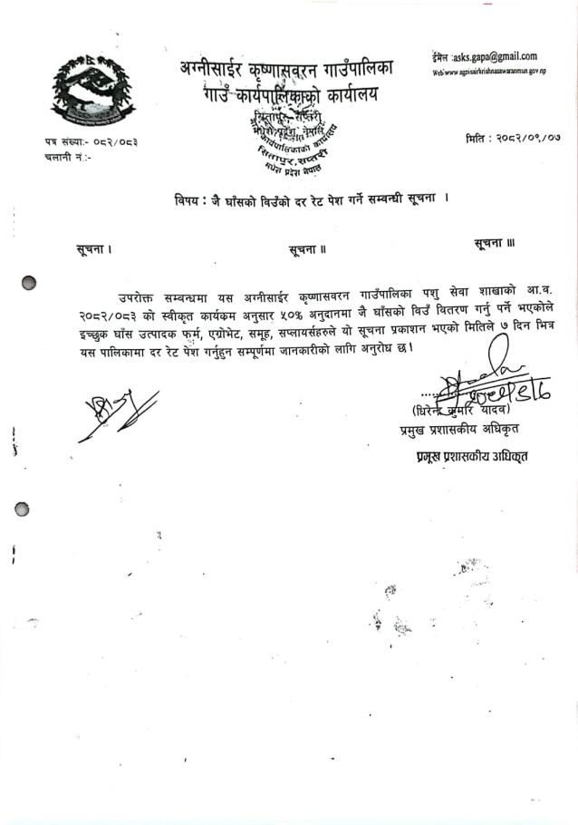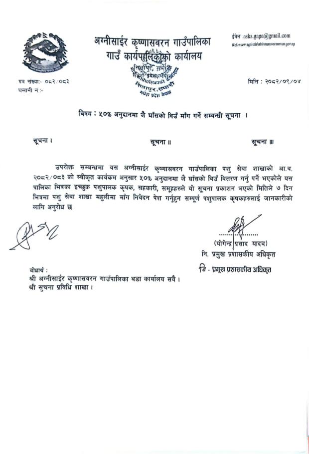 | ५० प्रतिशत अनुदानमा जै घाँसको विउँ माँग गर्ने सम्बन्धी सूचना | 12/19/2025 - 19:39 |