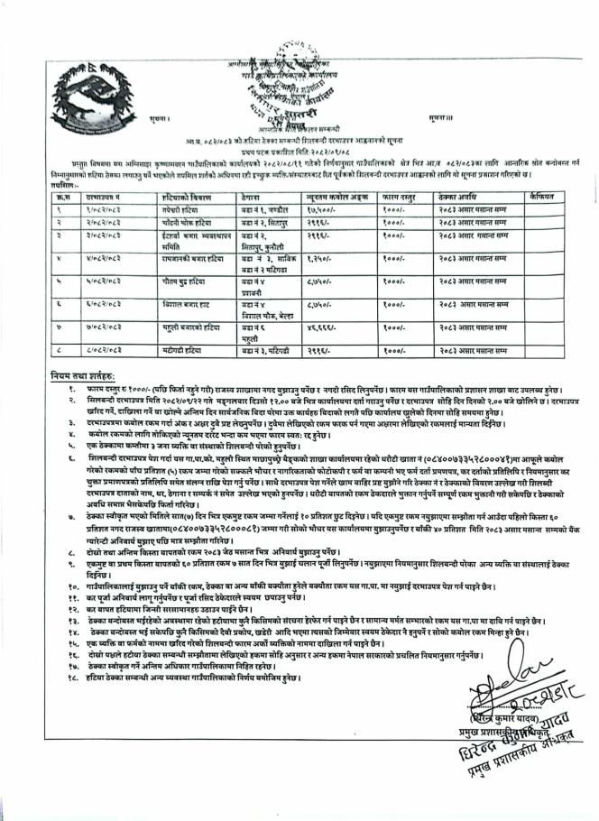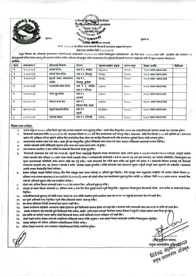 | आ.व.०८२/८३ को हटिया ठेक्का सम्बन्धी सिलबन्दी दरभाउपत्र आह्रवानको सूचना । | 12/24/2025 - 11:25 |