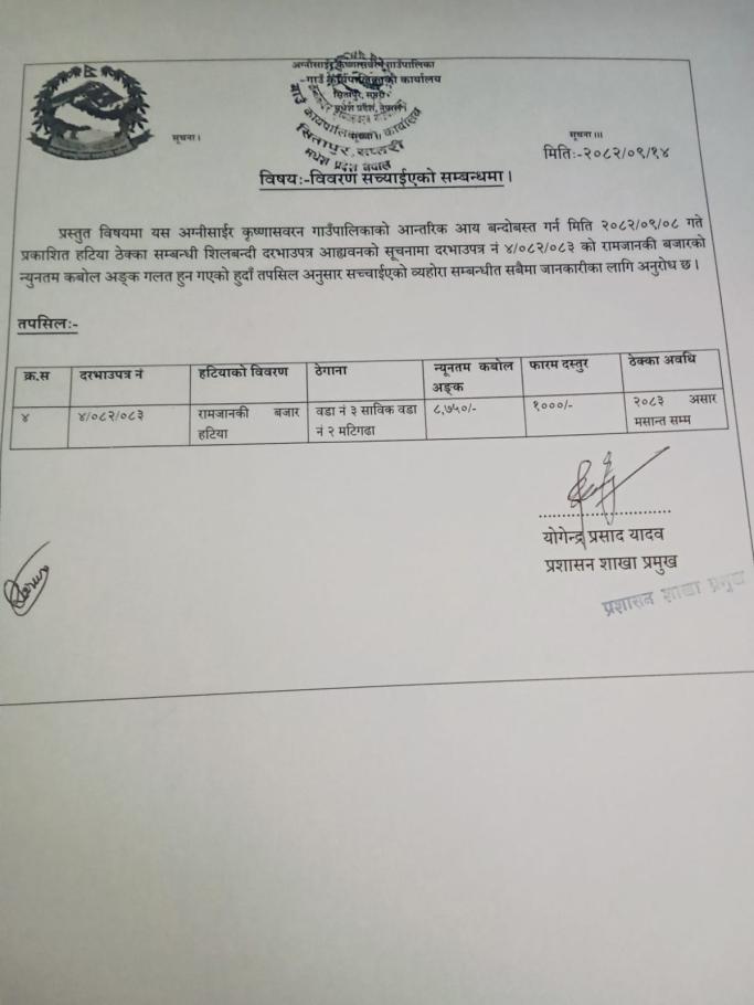 | हटिया ठेक्का सम्बन्धी शिलबन्दी दरभाउपत्र आवह्रानको सूचना(दोस्रो पटक प्रकाशित) | 01/07/2026 - 12:23 |